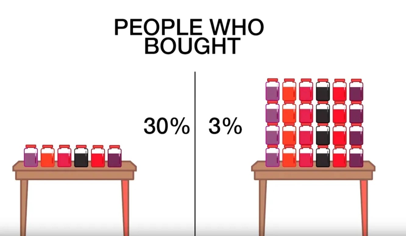The study, which has been quoted extensively and involved in several more recent meta-analyses, also shows that when you go from a few options to tons, people are more likely to either 1) freeze and not choose at all; 2) pick something by default (the first, last, or safest); or 3) feel less satisfied afterward, even if the choice was actually fine.